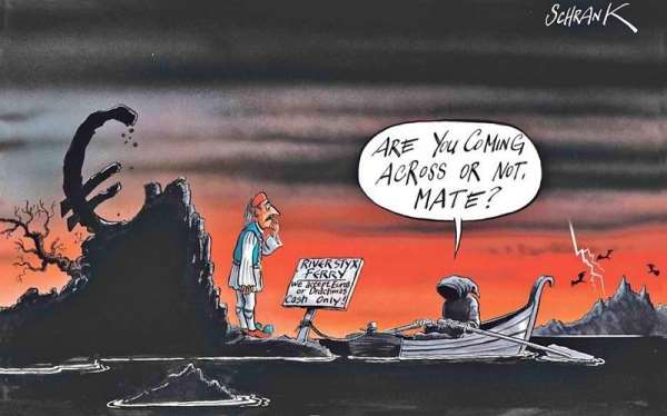 Στο σκίτσο της φημισμένης εφημερίδας, εμφανίζεται ο Χάροντας να δέχεται δραχμές ή ευρώ για να περάσει απέναντι έναν τσολιά. «Μακάβριο» το σκίτσο, ενδεικτικό του κλίματος που επικρατεί για τη χώρα μας στο εξωτερικό.