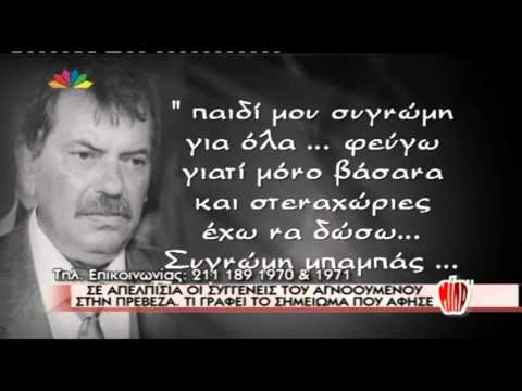 Σύμφωνα με αποκλειστικές πληροφορίες ο εξαφανισθείς άφησε σημείωμα στον γιό του στο οποίο γράφει μεταξύ άλλων “Δ. … παιδί μου συγνώμη για όλα … φεύγω γιατί μόνο βάσανα και στεναχώριες έχω να δώσω… Συγνώμη μπαμπας … Γιασας σας αγαπώ”