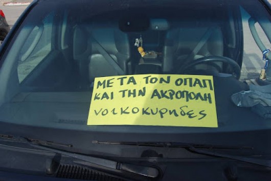 Τον σταμάτησαν στις 08:00 χθες το πρωί (21-05-2013) άνδρες της ομάδας ΔΙ.ΑΣ οι οποίοι και του ζήτησαν να την κατεβάσει. Ο λόγος; Ενοχλήθηκαν οδηγοί επειδή τους αποσπούσε την προσοχή.