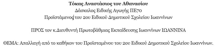 α παραπάνω ζητήματα έχουν ήδη φορτίσει αρνητικά την ατμόσφαιρα μέσα στο σχολείο μας – και όχι μόνο- κι αυτό πιστεύω είναι γνωστό σε σας και τους Προϊσταμένους σας. Γνωστό επίσης σας είναι ότι, χωρίς το έμψυχο δυναμικό των σχολείων τη διάθεση, τη θέληση και την καθημερινή προσφορά του, εκπαιδευτικό έργο δεν μπορεί να υπάρξει. Για τους λόγους αυτούς, παρακαλώ να με απαλλάξετε από τα καθήκοντα του Προϊσταμένου του 2ου Ειδικού Δημοτικού Σχολείου, καθώς η θέση αυτή με φέρνει αντιμέτωπο τόσο με τη συνείδησή μου ως εκπαιδευτικού και ως ανθρώπου, όσο και με τη βούληση των συναδέλφων μου, όπως αυτή εκφράζεται μέσα από τις συλλογικές αποφάσεις των συλλόγων διδασκόντων. Θέλω να συνεχίσω να προσφέρω το εκπαιδευτικό μου έργο ως απλός δάσκαλος της τάξης, χωρίς χρέωση διοικητικού έργου, κοιτώντας κατάματα τους συναδέλφους μου, τους μαθητές μου, τους γονείς τους, την κοινωνία.