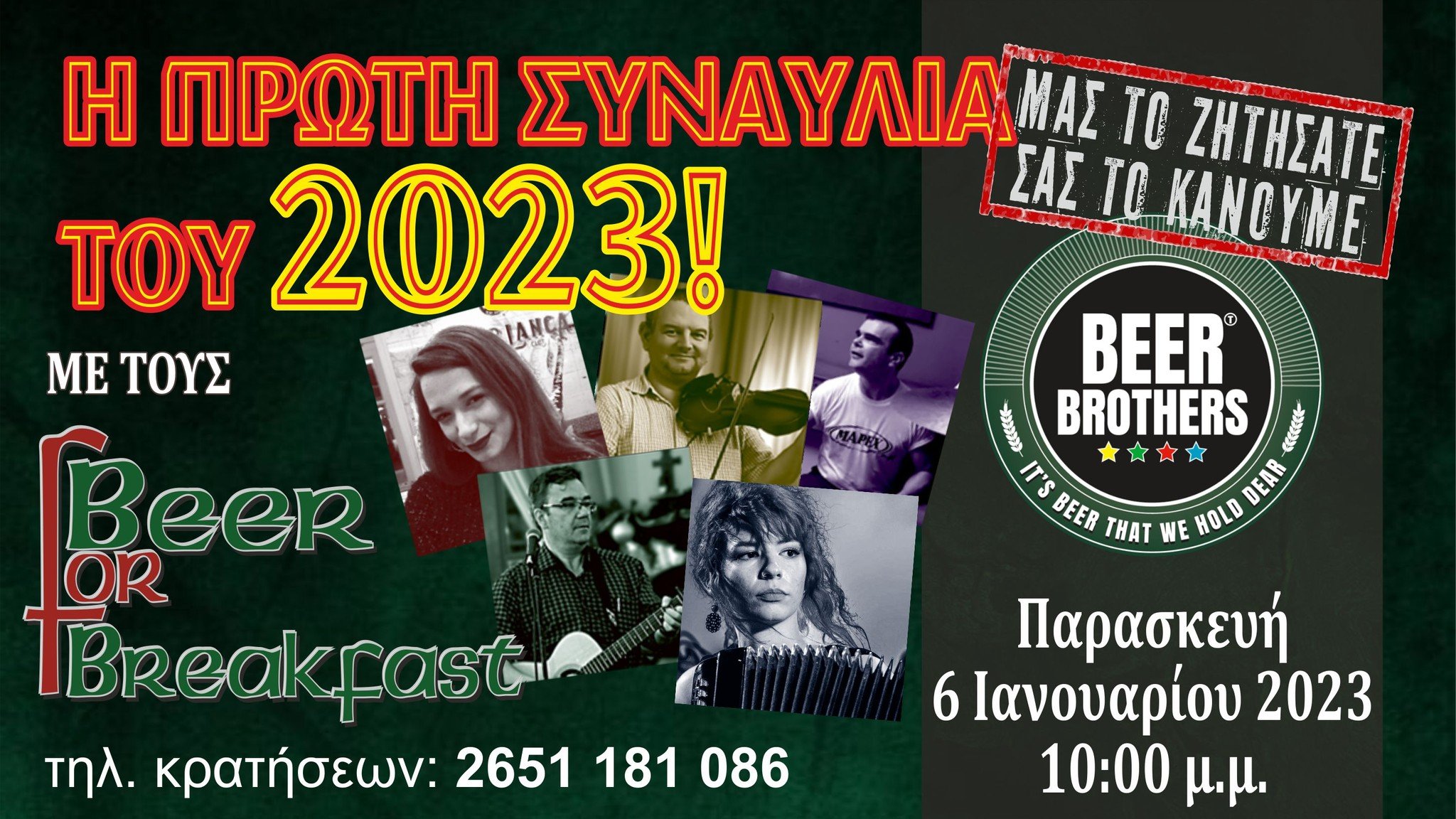 Με μια μεγάλη συναυλία στα Ιωάννινα, υποδέχονται οι Beer for Breakfast το Νέο Χρόνο 2023. Η συναυλία με τίτλο "Folk till you drop" θα πραγματοποιηθεί την Παρασκευή, 6 Ιανουαρίου, στις 22:00 το βράδυ, στην μπυραρία Beer Brothers.