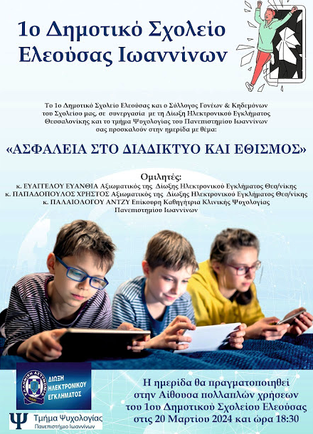 "Ασφάλεια στο διαδίκτυο και εθισμός"/Ημερίδα στο 1ο Δημοτικό Σχολείο Ελεούσας Ιωαννίνων